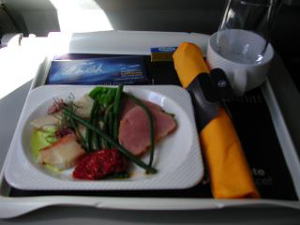 ![]() コールドミールの機内食 1時間余のフライトでは充分 |