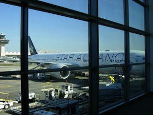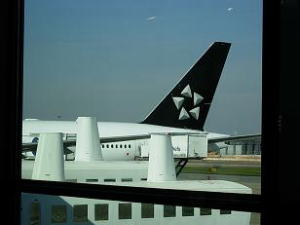 ![]() 土産を買物し戻ると、 スターアライアンス塗装のANA機が着いた。 |