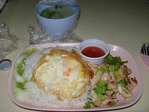 それから15分、料理が運ばれた。 チキンの炒め物と目玉焼き乗せライス。 ライスはカオパットにしとけばよかったかと、後悔。 スープは塩気がもう少し欲しい。 ビールと合わせ195バーツ。 10年前はトムカーカイが旨かった。 |
