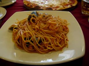 シーフードとトマトソースのスパゲッティ。 この通りに数件、イタリアンのレストランがあったが、 これが一番安い店に入る。 (といっても、230〜250バーツの20バーツ程度の違い) |