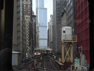 シカゴ川の上も高架鉄道は道路上を越えて行く。 |