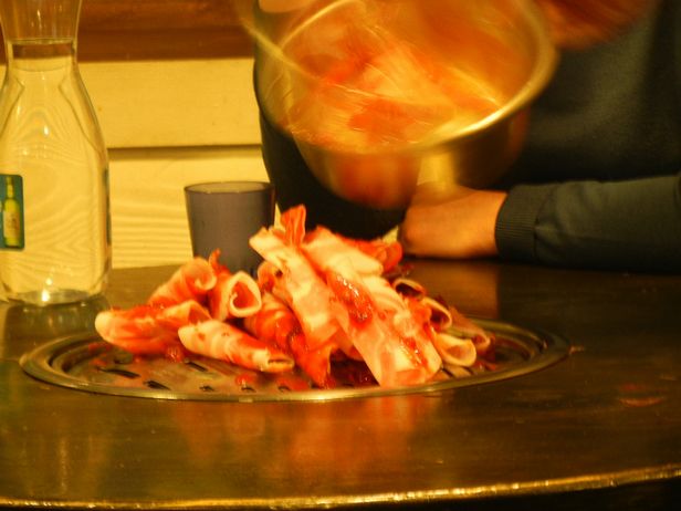 コリアナホテルで先月のバンコクに続きおっちゃんと再会。 肉食のおっちゃんは早く豚を食べたいとシンオーさんを待たずに食べる気満々です。 |