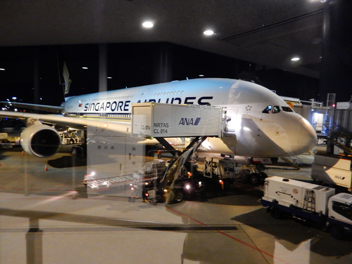 隣の45番スポットにはロサンゼルスへ向かうシンガポール航空のA380が駐機してます。