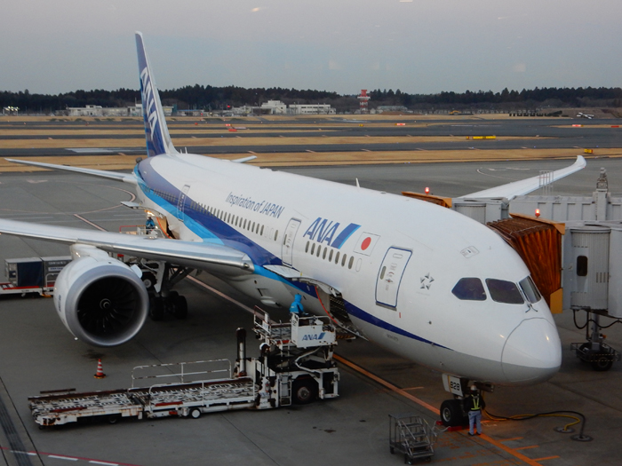 JA828A。以前、ハノイから乗った機がエンジンを交換し、メキシコシティに飛ぶ4機になったようです。国際線で最初に乗ったB787です。