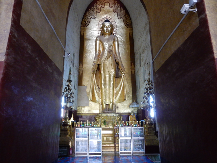 白亜の外壁と黄金の尖塔のアーナンダ寺院。