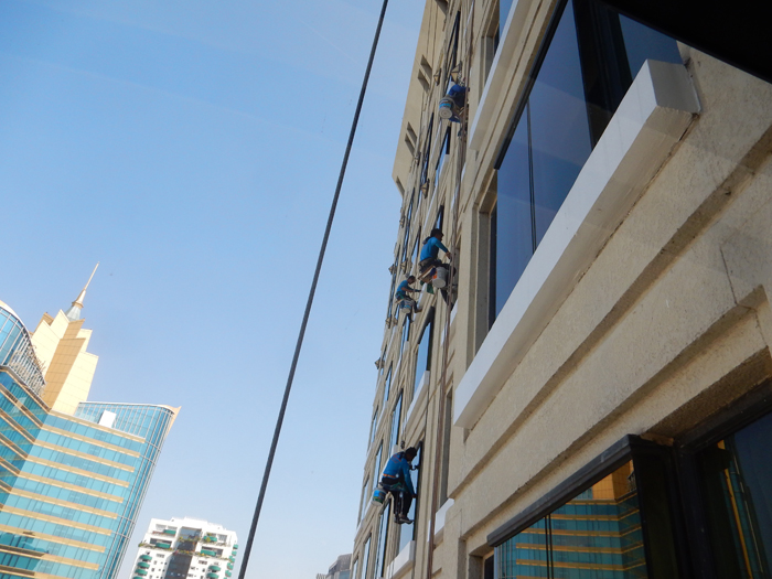 プールから戻りエレベータホールから外を眺めると窓清掃。ゴンドラでなく驚きます。