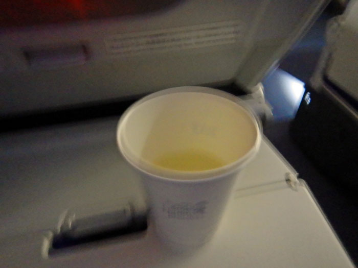 水入りスナック袋とドリンクは出発から約1時間後でした。トイレに立ち上がった時間からするとベルトサイン消灯まで離陸から30分近く経ったようです。