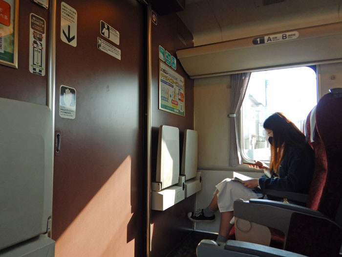 姫路から反対側に6号車3人目の客。アジア系外国人です。前の車両へ行こうとドアを開けようとしてるので一番前だと教えると反対側に座ってしまいました。車掌が来た際に追加料金を払った様子はなかったのでジャパンレールパスでも持っていたのでしょう。