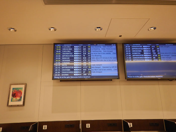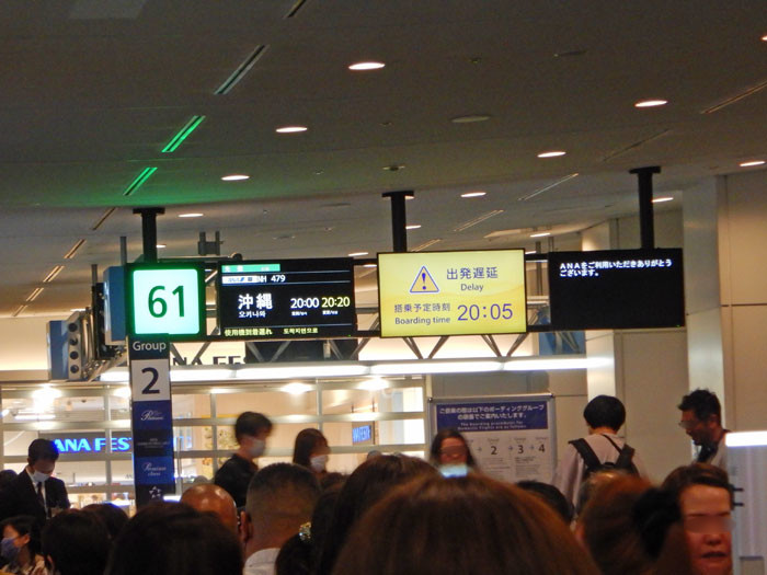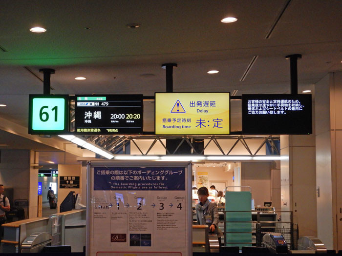 搭乗口へ行くと出発時刻は20分遅れ。搭乗予定時刻は未定です。