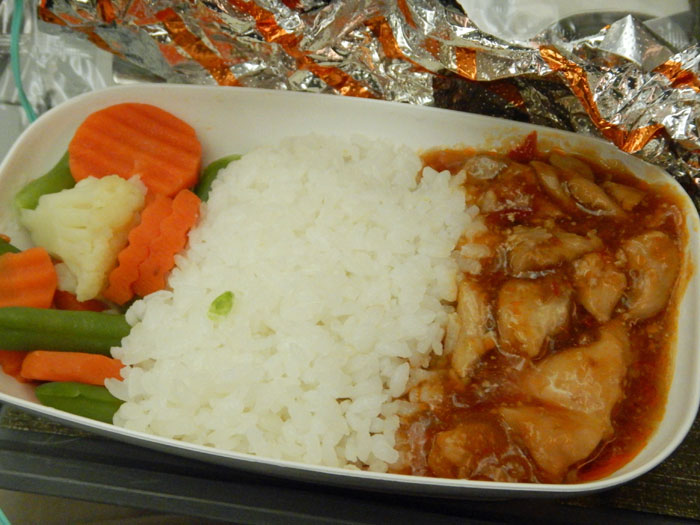 鶏肉のスパイシーソース炒め。もう一品は成田からと同じくイタリアントマトの魚の切り身炙り、焼サツマイモ添えでした。
