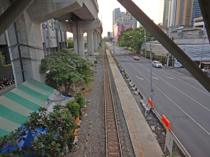 MRTへの歩道橋でタイ国鉄の線路を渡ります。こちらは東へ向かう列車のホーム。