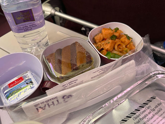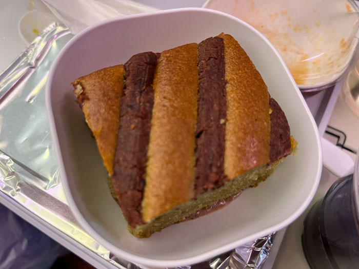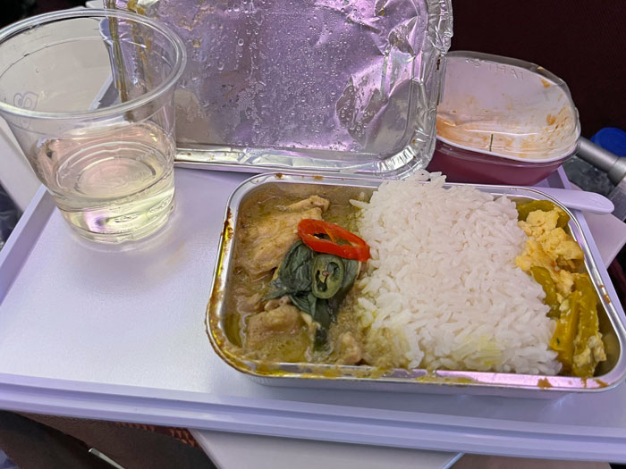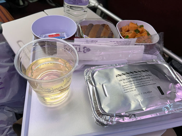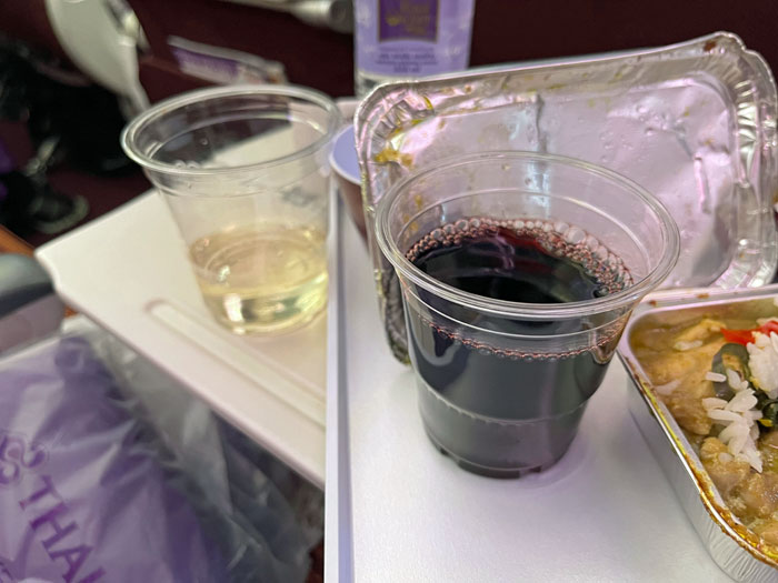 離陸から40分。機内食です。いつものように白と赤をお願いしたら、1杯飲んでからと断られ、まずは白です。