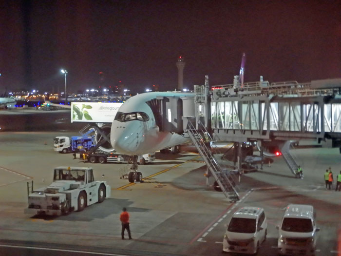 実はいつものようにB滑走路(22)に着陸したものと思い込んでました。着陸してから税関申告してないと思い出しQRコードを取得。なかなか着かないと窓の外を見れば格納庫の前。ここで気づきます。税関申告さえ済ませてれば、いつもと違う外の景色が見られたと後悔してます。着陸から12分後の23時18分に到着。