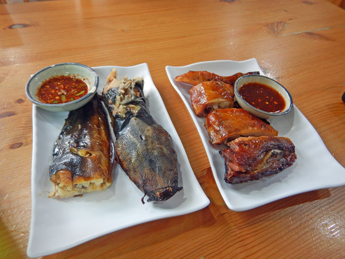 プラードゥックヤーン(焼ナマズ)とガイヤーン。ナマズなんて珍しいもの頼んでるなぁと思ってみると、結構、ここで食べてる方がいるようなので、どなたかのブログを参考にしたのでしょう。ナマズは昔、屋台でよく買ってました。
